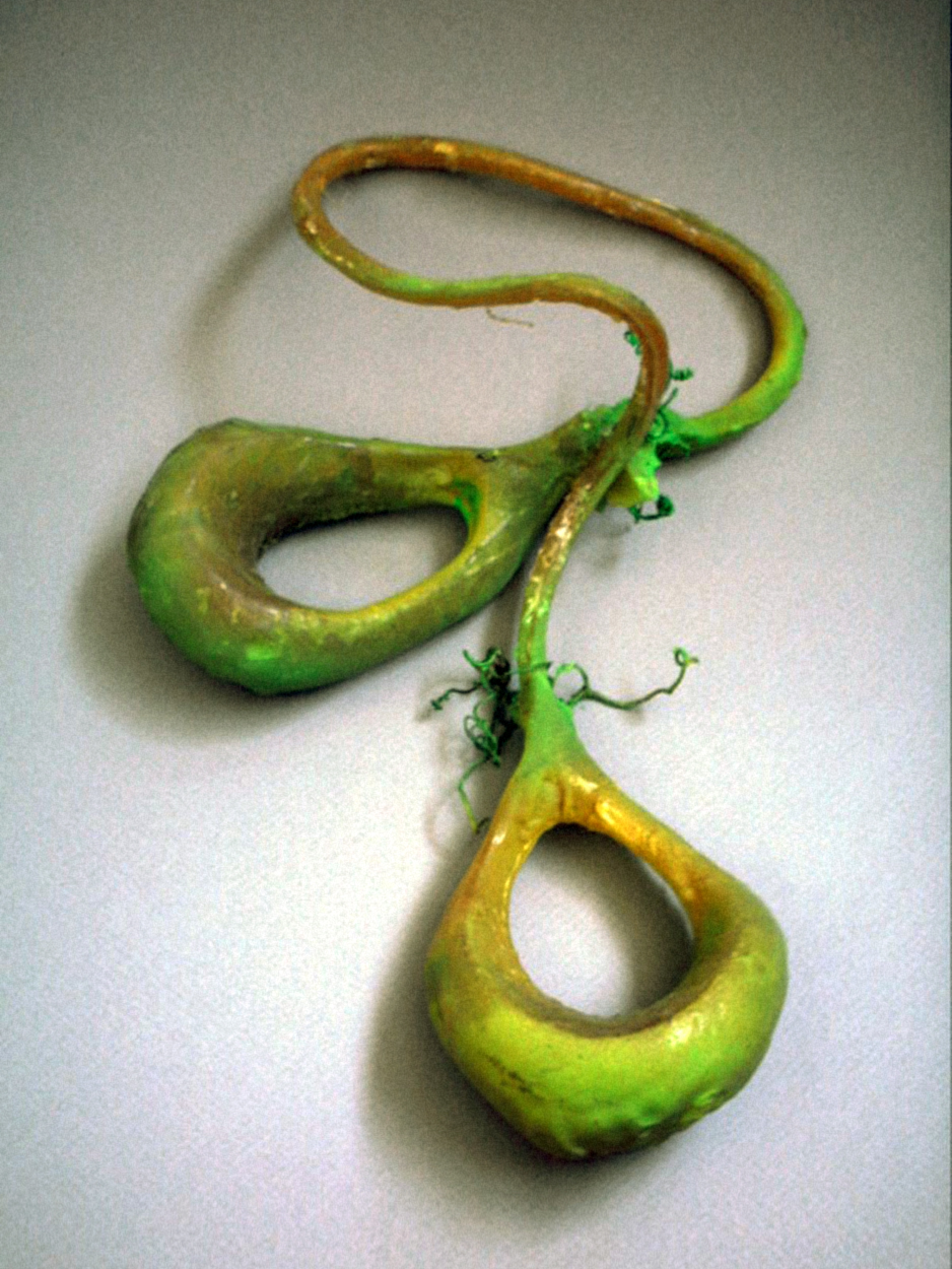 Veal fruit/Nano 7275 visualized the darker side of industrial farming and had the direct color, texture and proportion references [anatomy- and physiology-wise] that made the concept of the plant as a field-bound alien organ a viable one, and it pointed in the direction of the cloaked cloaca-kind-of agriculture required for its infrastructure. Neeners, by contrast, grew like wild jewelry on vines that crawled out of rusted automobile hulks and possessed a syrupy goopiness in their interior that played-off of the fruit’s flourescence and its elongatedly fluid, open-centered, almost wearable form.